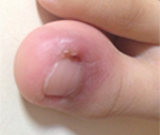 甲沟炎常先发生在一侧甲沟皮下,表现为红肿、疼痛。有的可自行消退,有的则蔓延到甲根部的皮下及对侧甲沟,使症状加重。